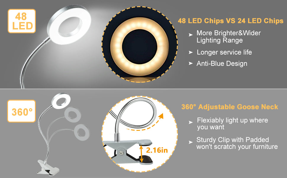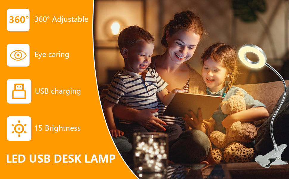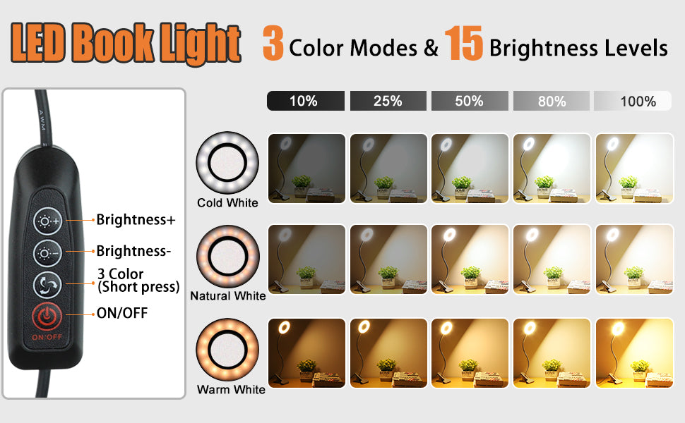 DINGLILIGHTING 6W Dimmable LED USB Clip Reading Light for Books, Bedroom, Desk Lamp with Clamp, Eye Protection. Book Light for Reading in Bed, Kids. Warm, Natural & Cool Light 3 Colour Adjustable