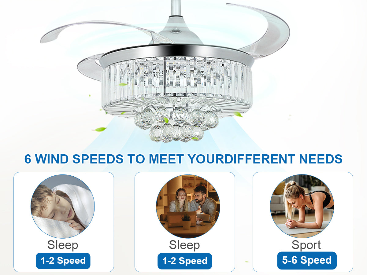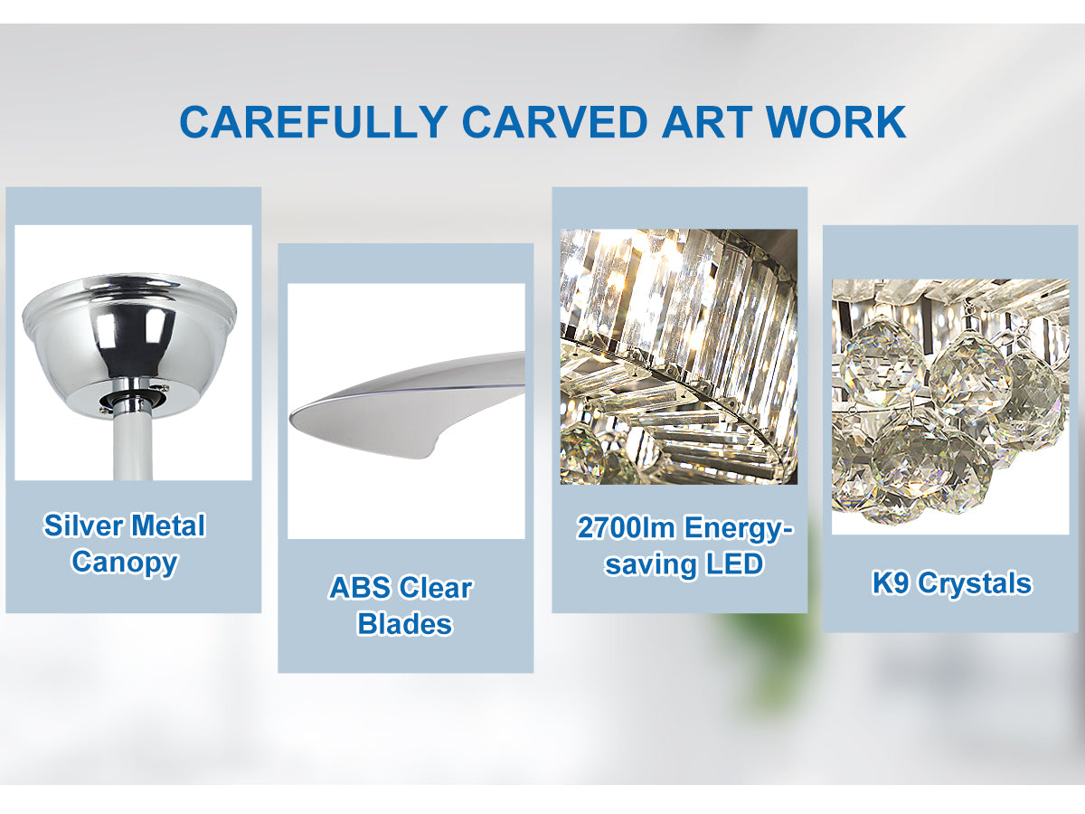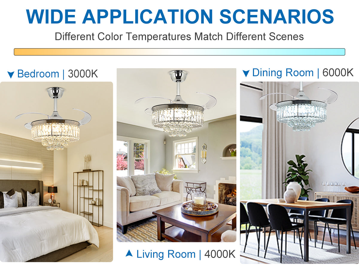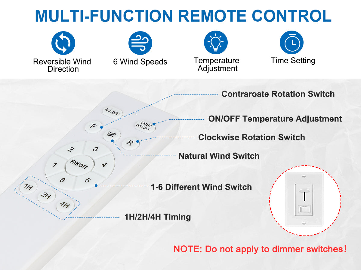 | Special Features | Quiet & Reversible DC motor, 3.9"/7.9" Downrods, 1/2/4H Timer, Air Circulation, Memory, 6 Speeds, 3 color temperature |